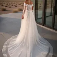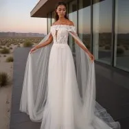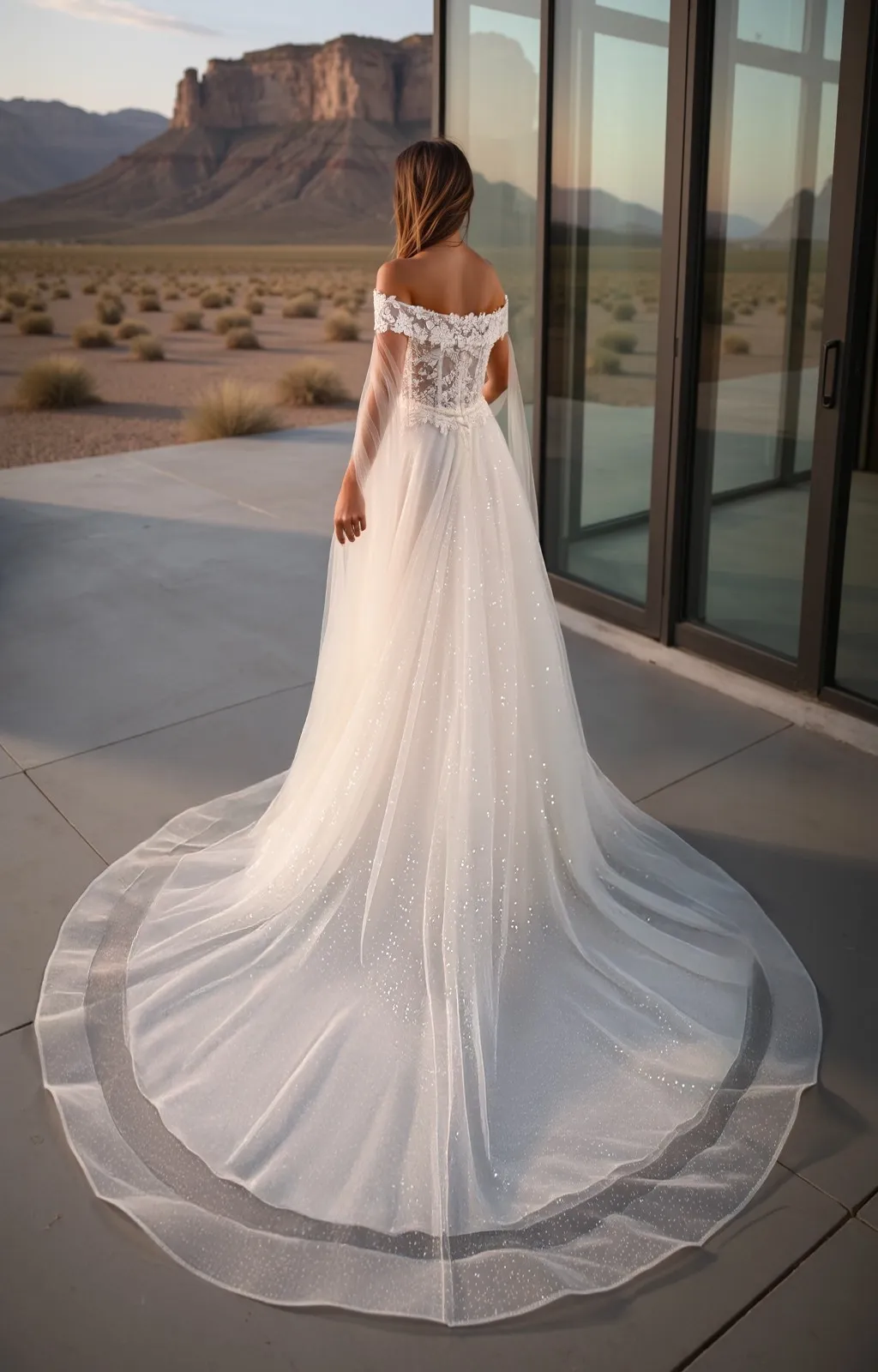 Cette robe de mariée romantique séduit par son corsage en dentelle délicatement ajourée et son décolleté en cœur sublimé par des manches tombantes. La jupe fluide en tulle pailleté se prolonge d’une traîne légère et aérienne, tandis que la cape intégrée ajoute une touche d’élégance et de majesté à l’ensemble. Une création empreinte de douceur et de modernité, parfaite pour une mariée bohème et raffinée.