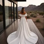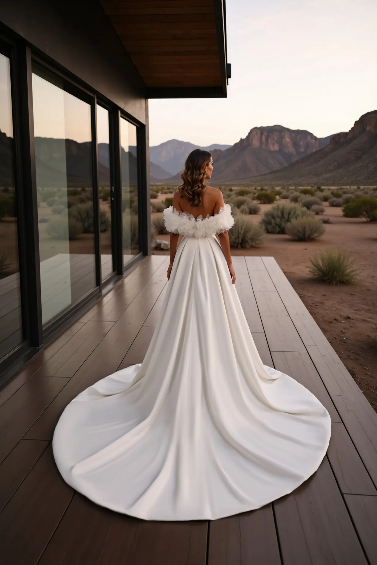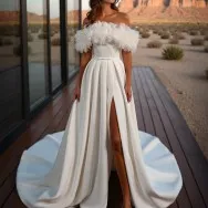 Sublimez votre silhouette avec cette robe de mariée en satin, à la fois élégante et contemporaine. Son décolleté bardot est magnifié par de délicates fleurs 3D (amovibles), apportant une touche romantique et couture. La jupe fluide à fente révèle subtilement la jambe, tandis que la traîne longue et structurée offre une allure majestueuse.