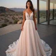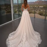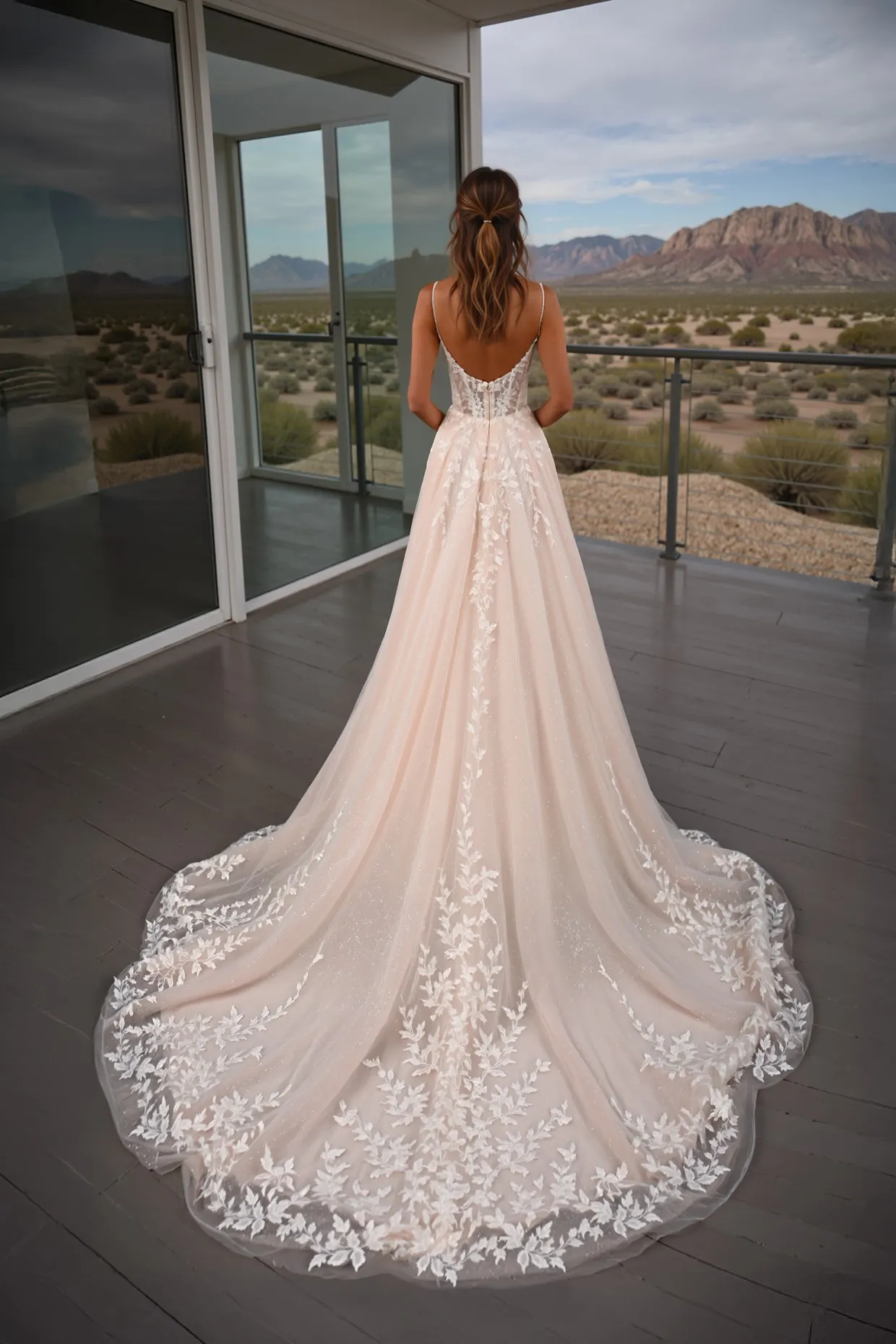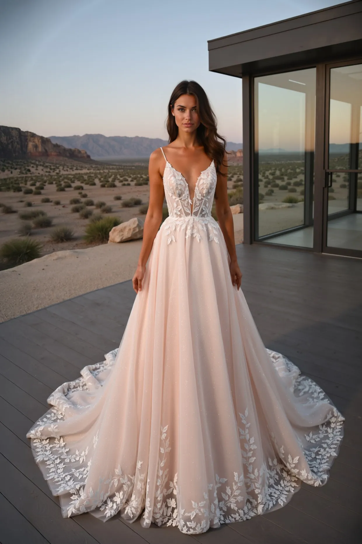 Cette somptueuse robe de mariée séduit par son bustier illusion au décolleté plongeant et ses fines bretelles délicates. Sa jupe fluide en tulle scintillant s’ouvre sur une majestueuse traîne ornée de motifs floraux brodés, offrant une allure romantique et raffinée. Parfaite pour la mariée moderne en quête d’élégance et de légèreté.