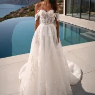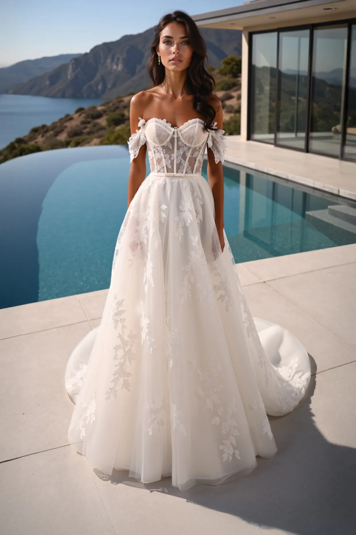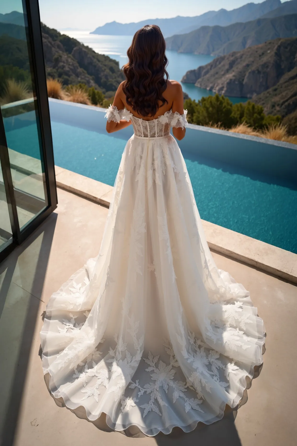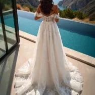 Élégante et romantique, cette robe de mariée séduit par son bustier structuré en tulle transparent délicatement rehaussé de dentelle florale. Les manches tombantes apportent une touche de douceur, tandis que la jupe fluide en tulle brodé s’ouvre sur une traîne légère et aérienne. Une création alliant modernité et féminité pour un look de mariée inoubliable.