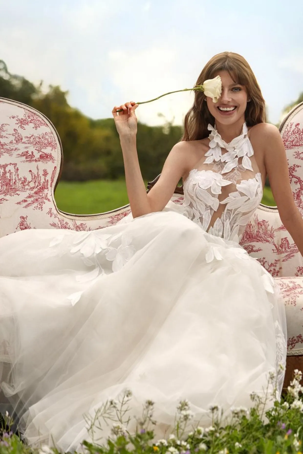Légère et charmante, cette robe à col halter et dos ouvert bouge avec fluidité. Le tulle et la dentelle apportent texture et transparence, créant un look frais et élégant.
