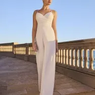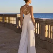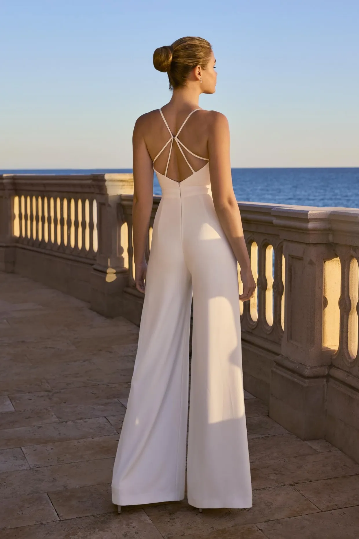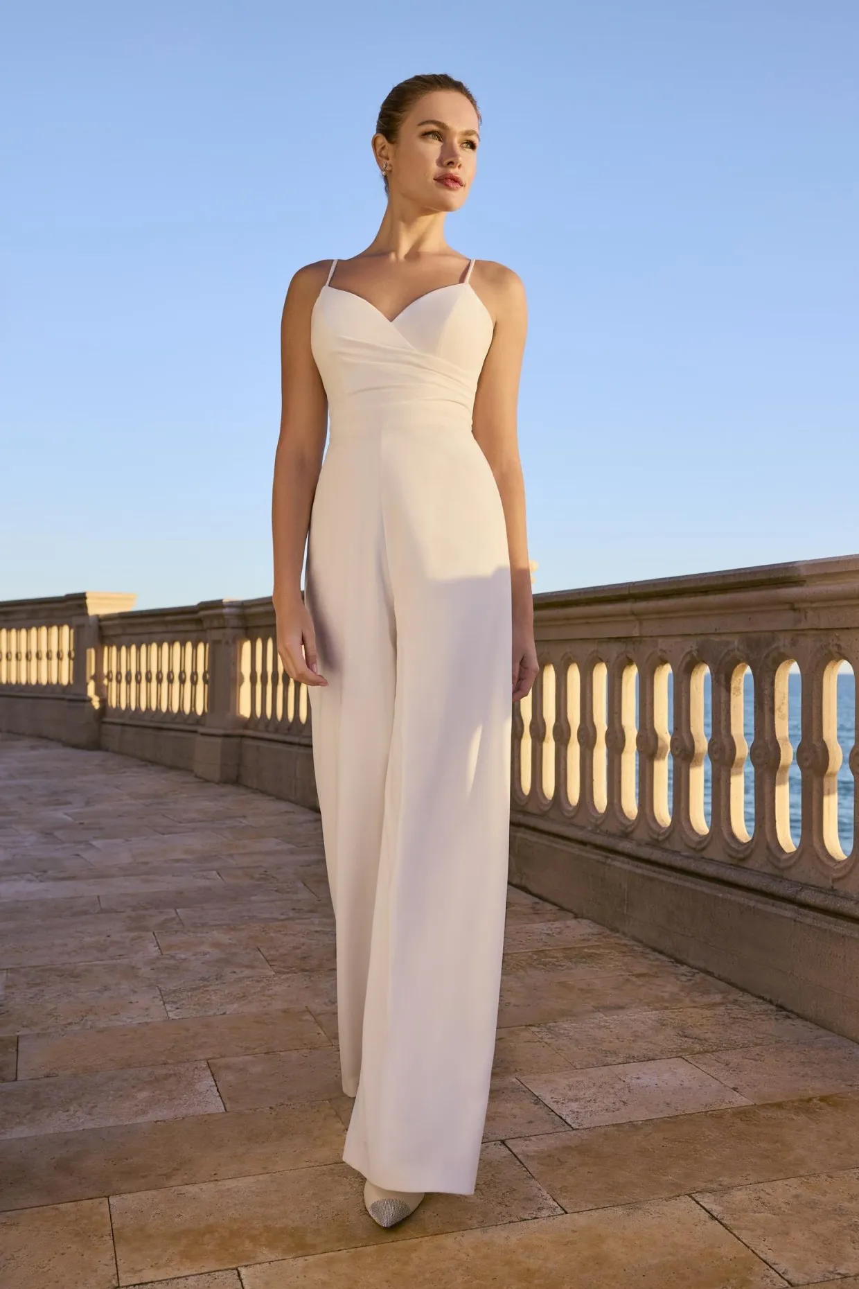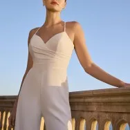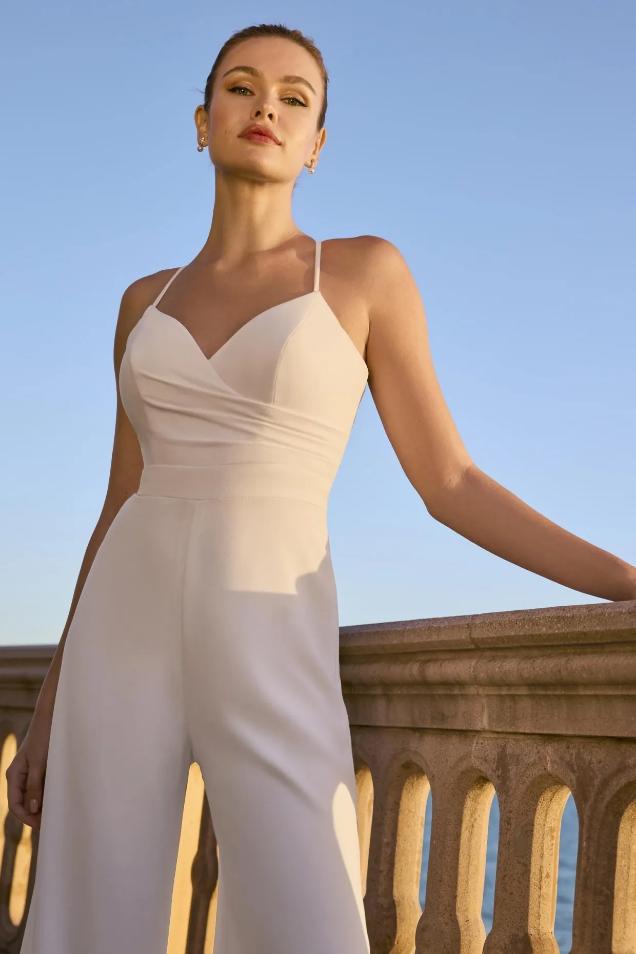 Une combinaison de mariage raffinée en crêpe, avec un décolleté en V séduisant, alliant coupe structurée et élégance naturelle — idéale pour la mariée moderne en quête de polyvalence.