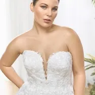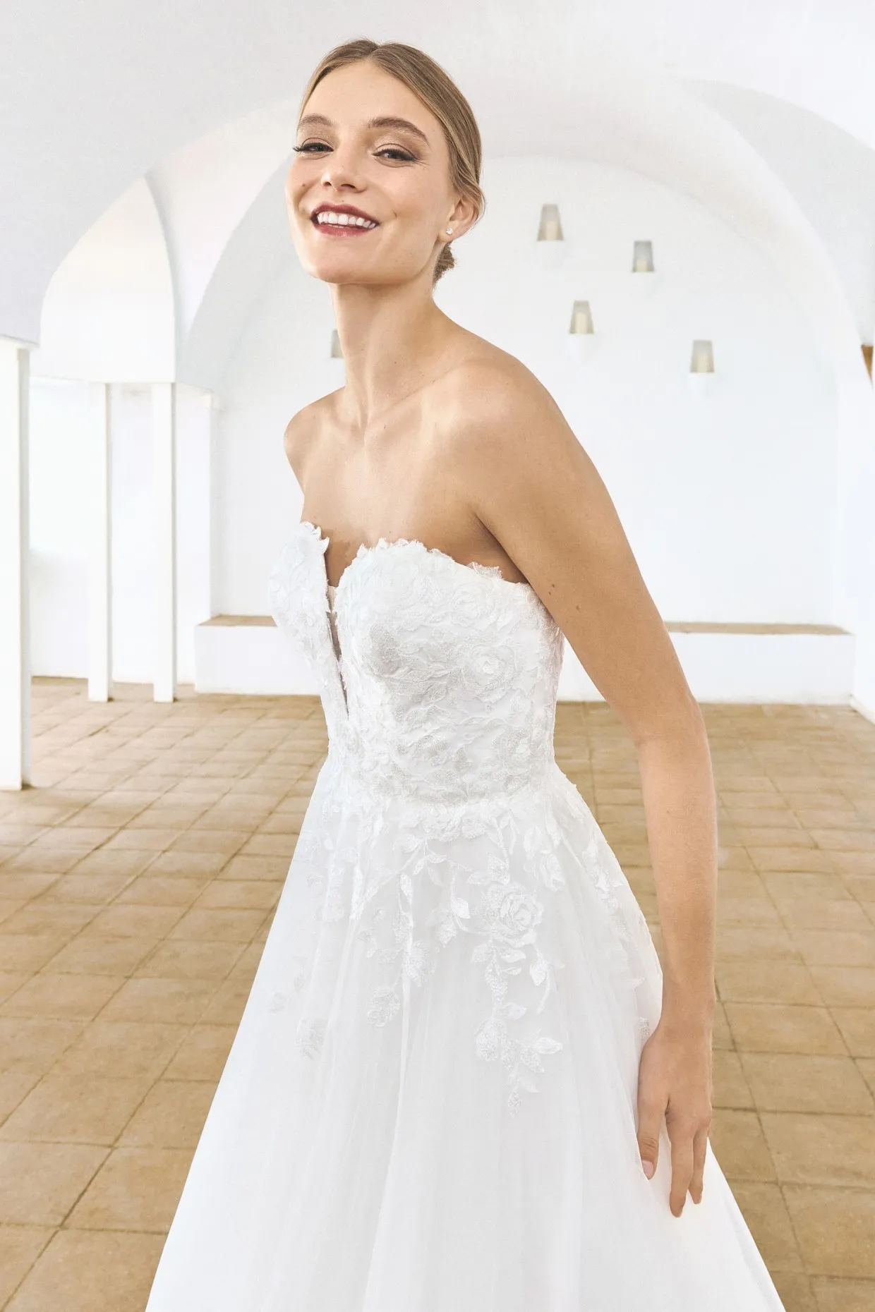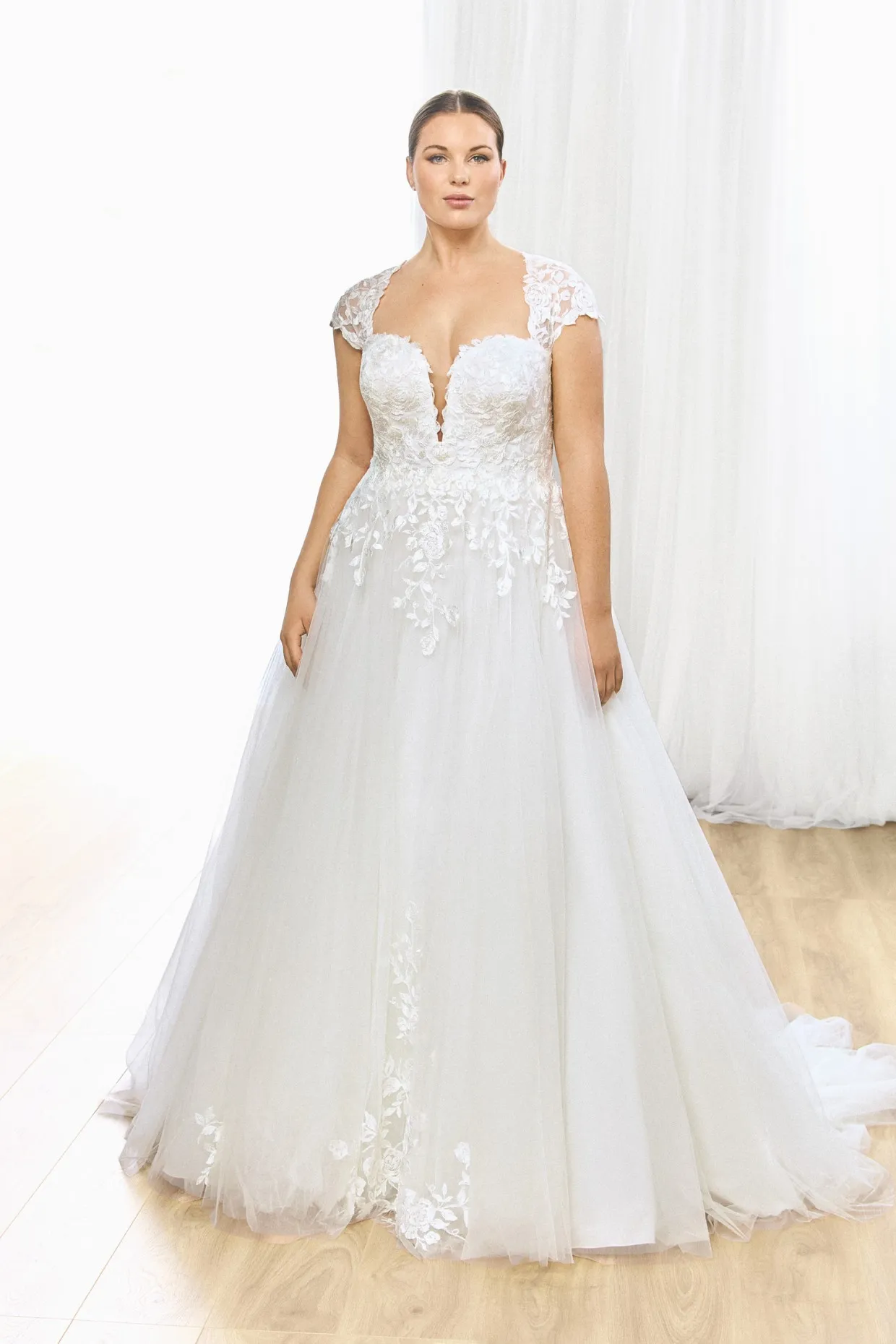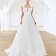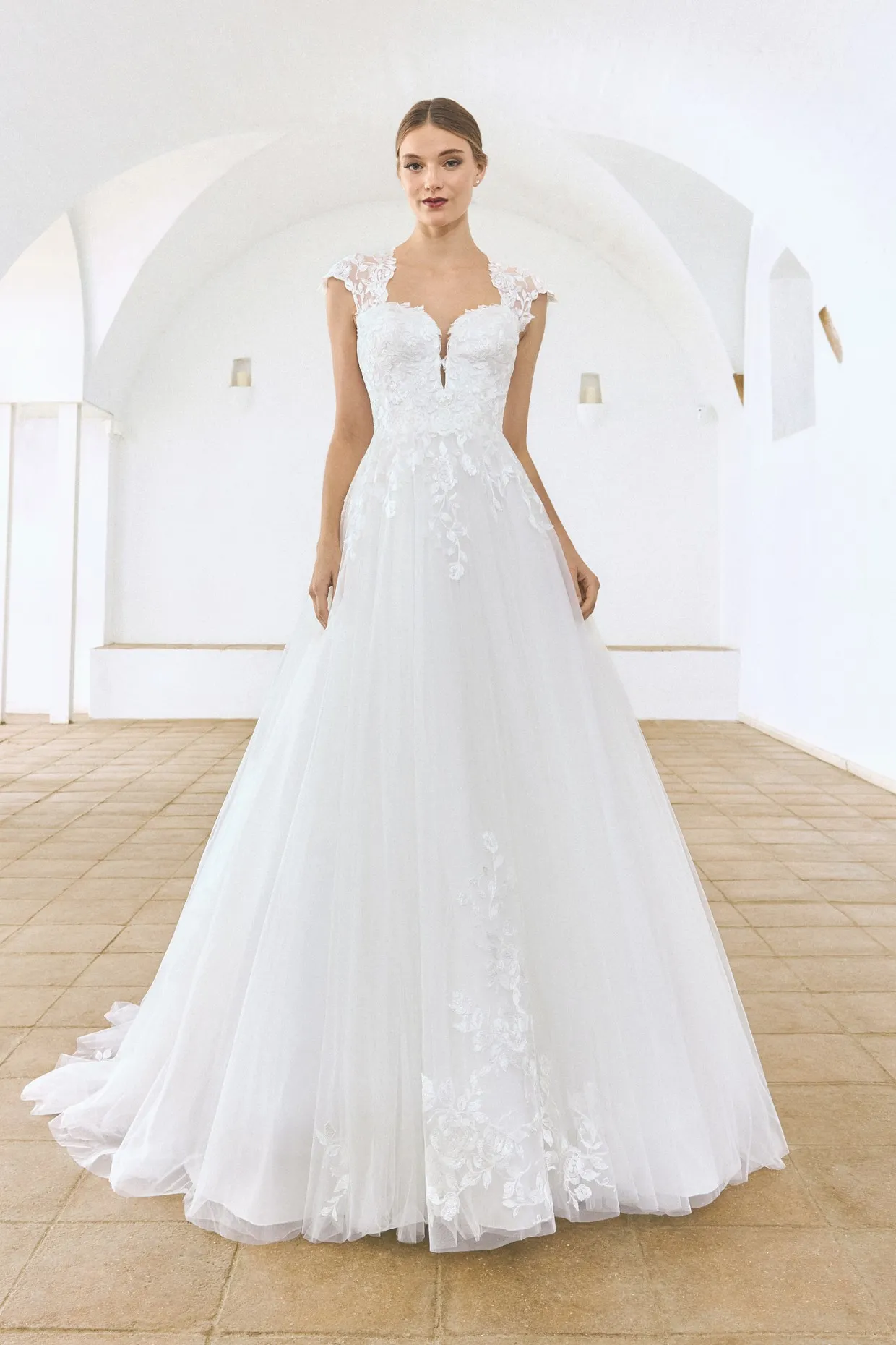 Avec son décolleté en cœur et sa jupe en tulle ample, cette robe princesse célèbre la beauté nuptiale classique. Les ornements en dentelle et perles ajoutent du relief et du charme, idéale pour une mariée rêvant d’un moment féerique.