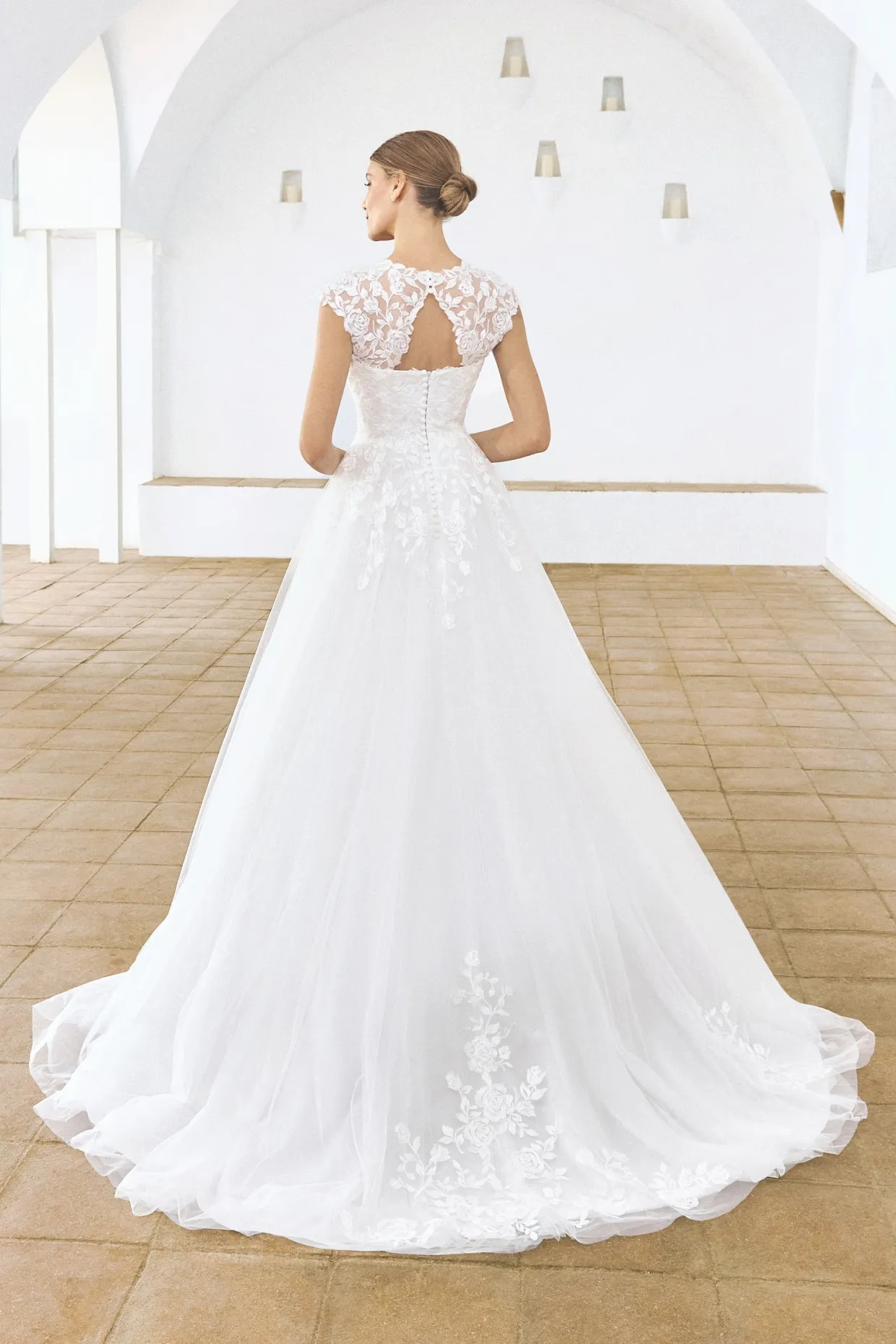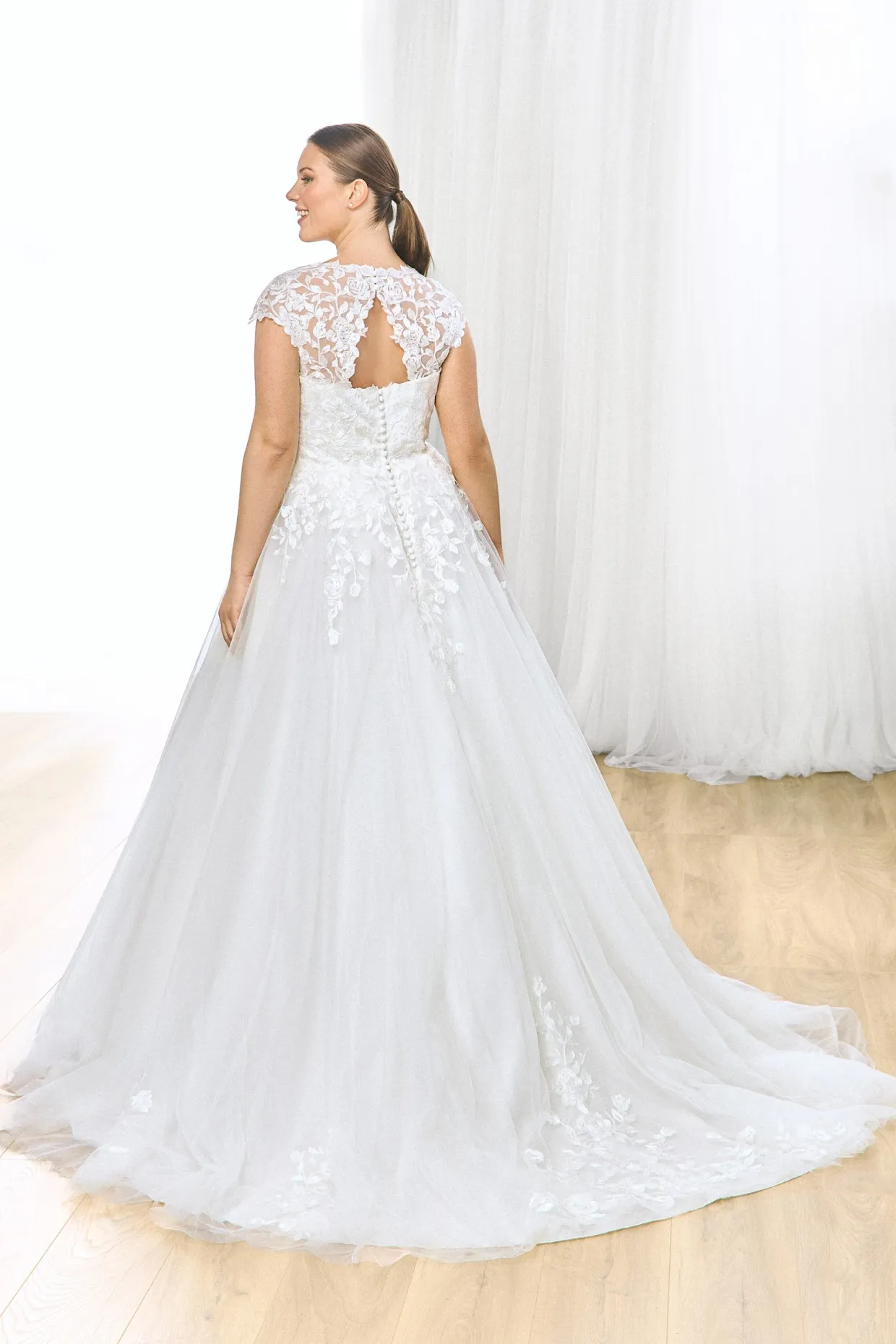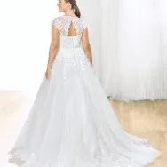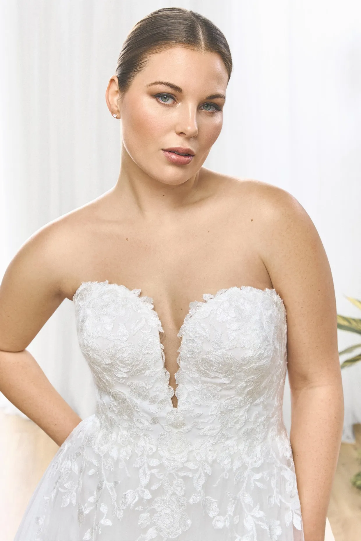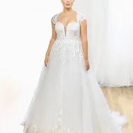 Avec son décolleté en cœur et sa jupe en tulle ample, cette robe princesse célèbre la beauté nuptiale classique. Les ornements en dentelle et perles ajoutent du relief et du charme, idéale pour une mariée rêvant d’un moment féerique.