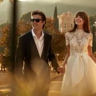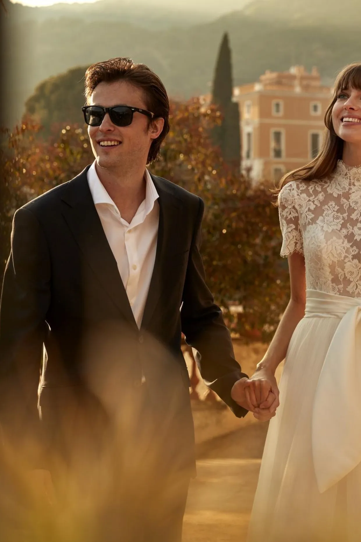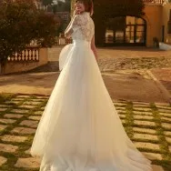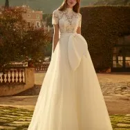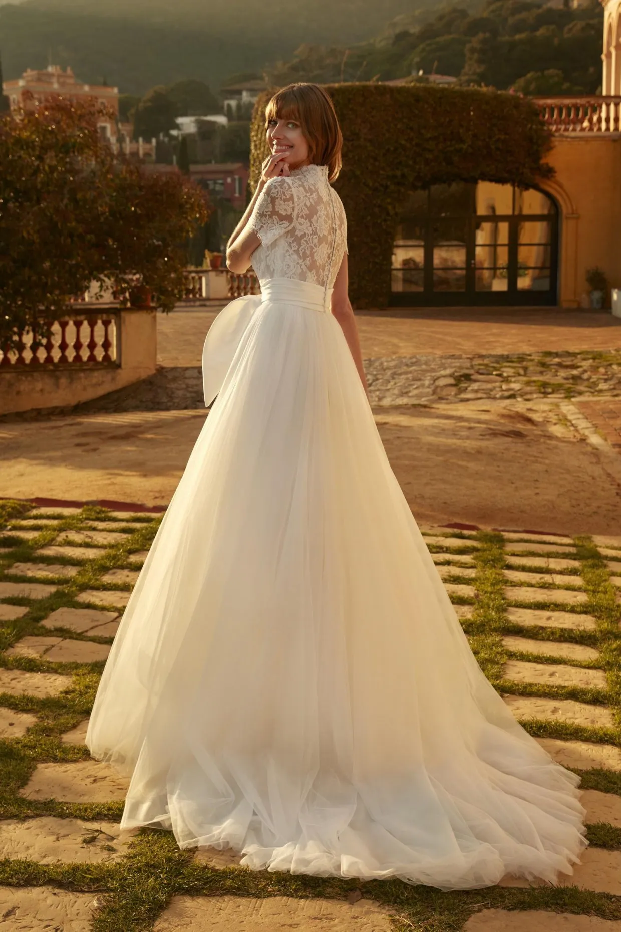 Cette robe à manches courtes, col montant et dos ouvert combine mikado, tulle et dentelle pour créer une silhouette royale avec une touche de légèreté. Une proposition qui équilibre structure et fluidité avec maîtrise.