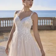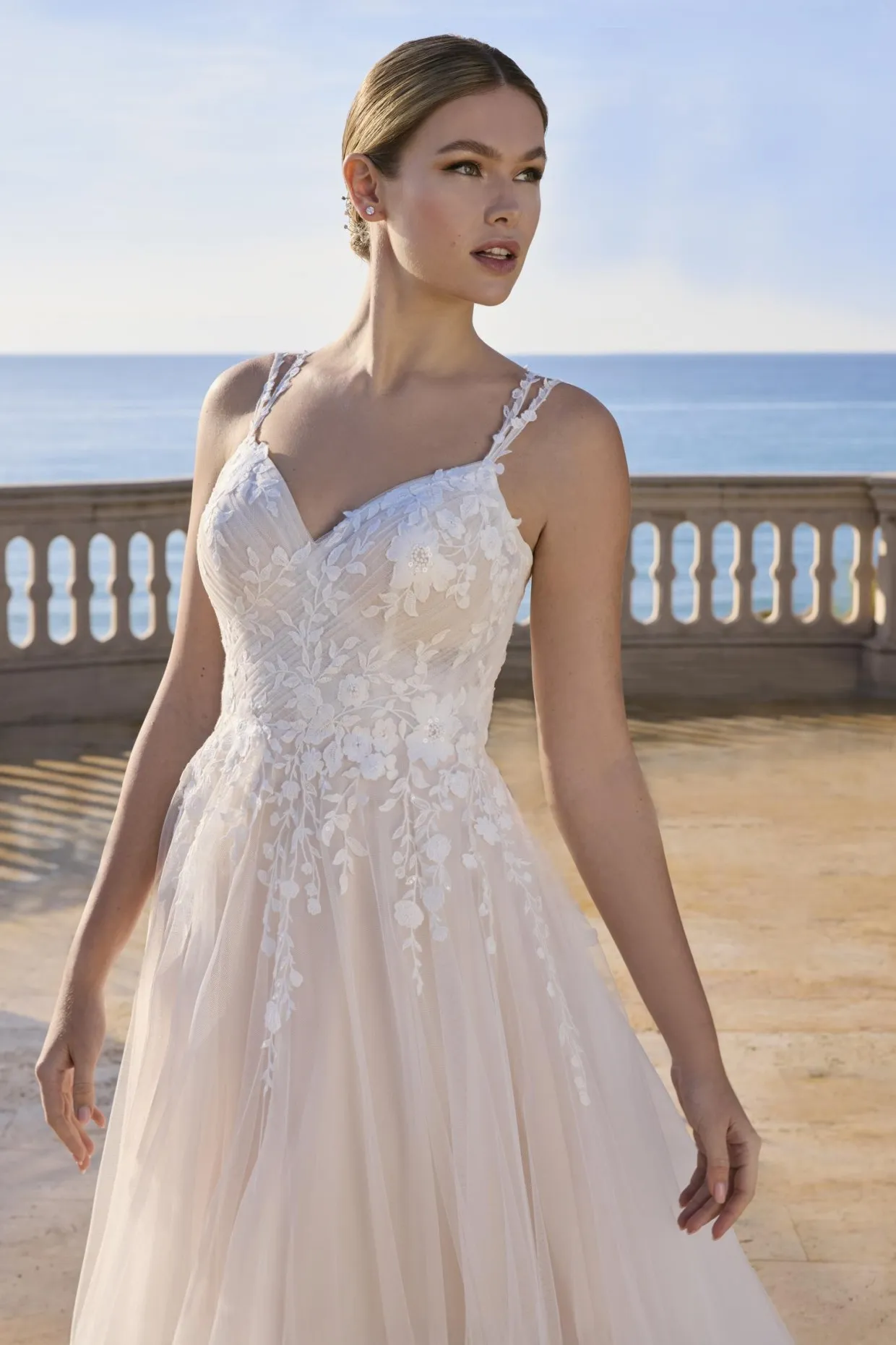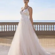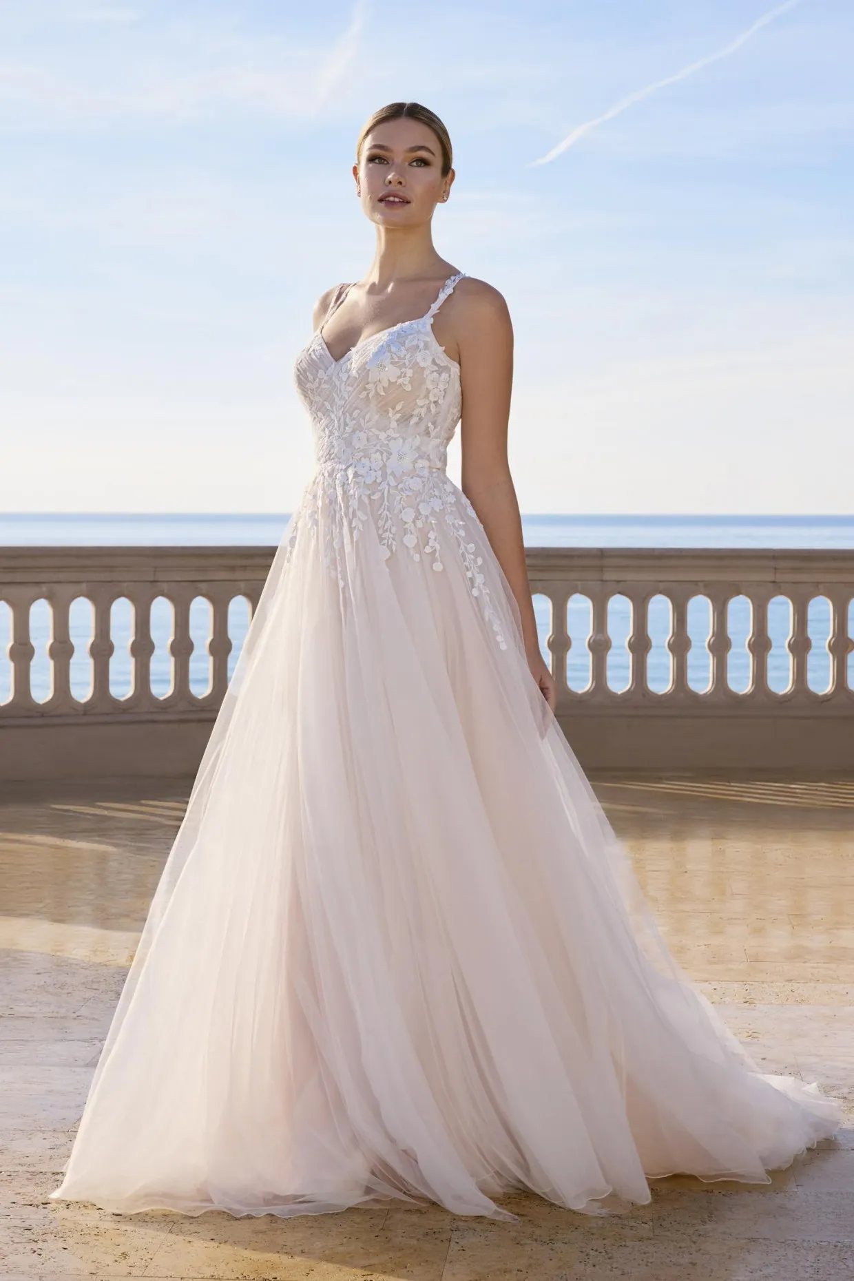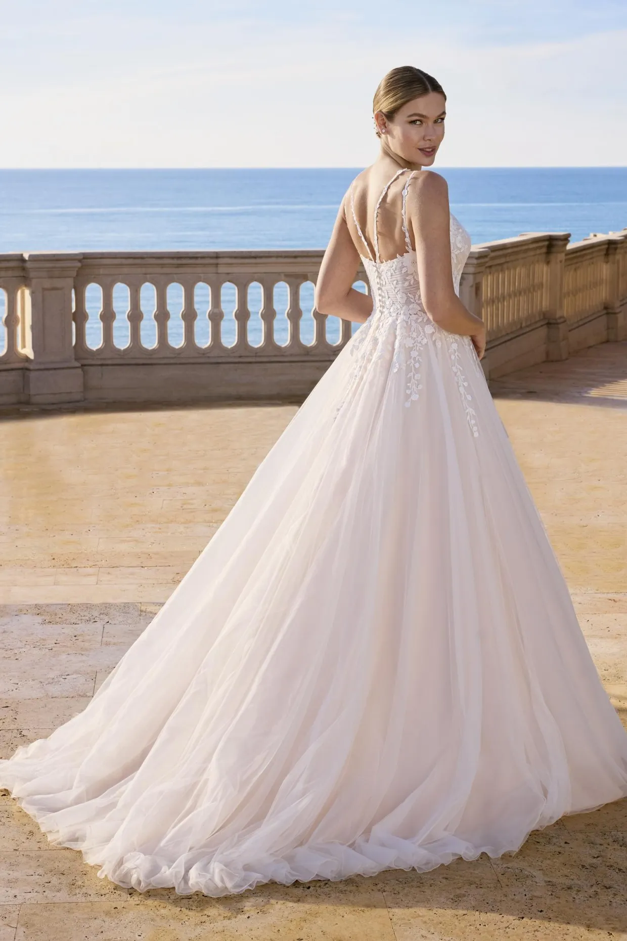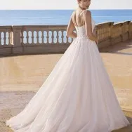 Romantique et raffinée, cette robe princesse présente un décolleté en V devant et derrière, réalisée en tulle doux, agrémentée de dentelle et de perles délicates. Une expression élégante de la féminité moderne.