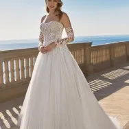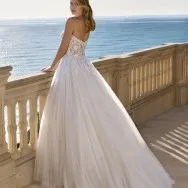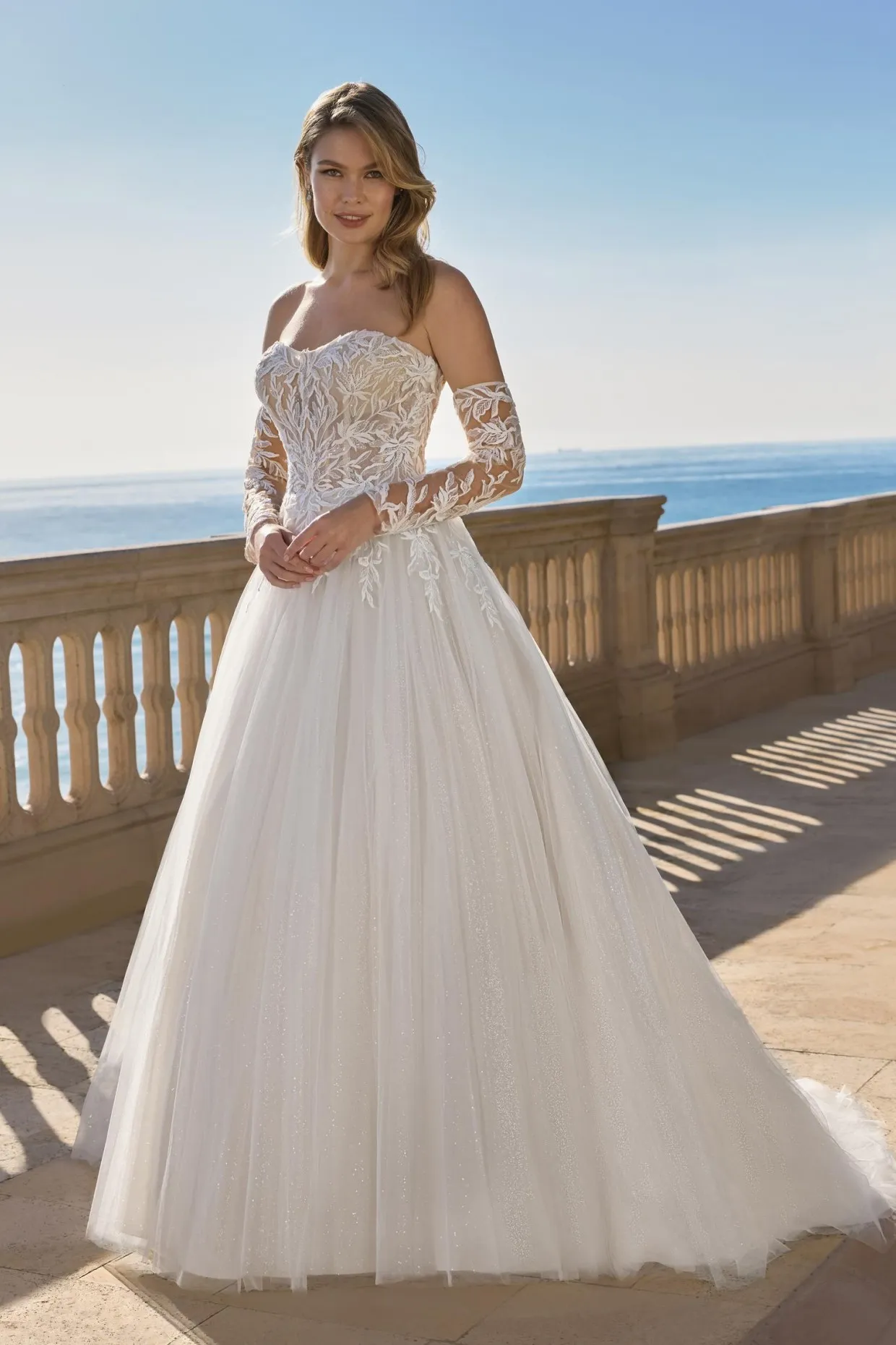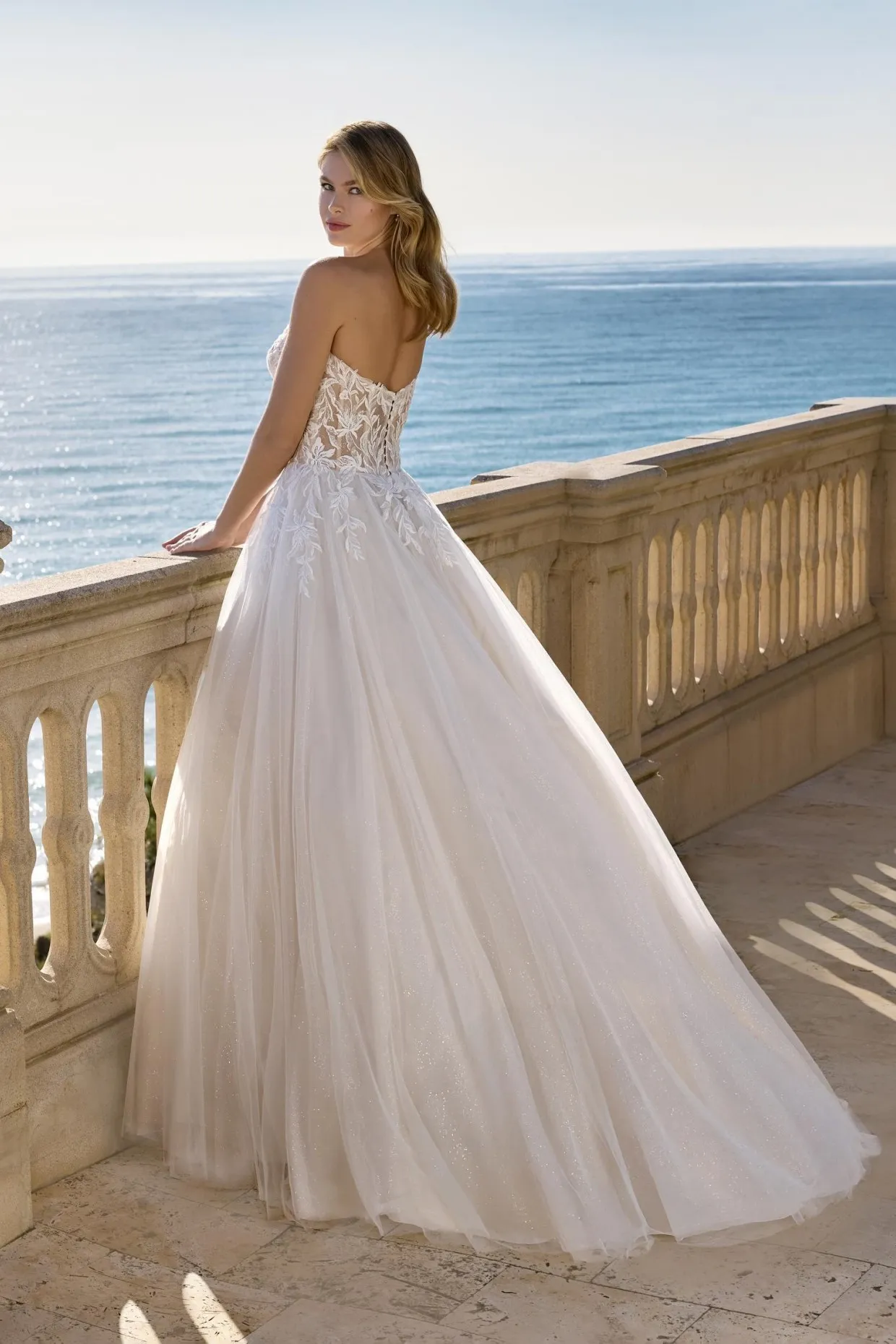 Une robe princesse bustier saisissante, ornée de tulle scintillant, d’accents brillants, de dentelle et de perles étincelantes. Cette création respire la sophistication rayonnante, parfaite pour une entrée remarquée.