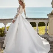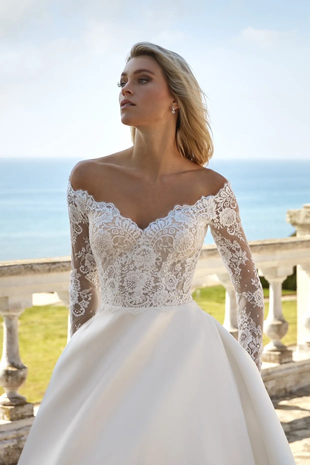 Cette robe ligne A à manches longues et encolure off-the-shoulders combine structure et délicatesse dans une silhouette enveloppante. Le corsage semi-transparent en dentelle apporte une touche sensuelle et raffinée, tandis que le mikado et le chantilly fusionnent dans une proposition équilibrant dramatisme et élégance.