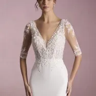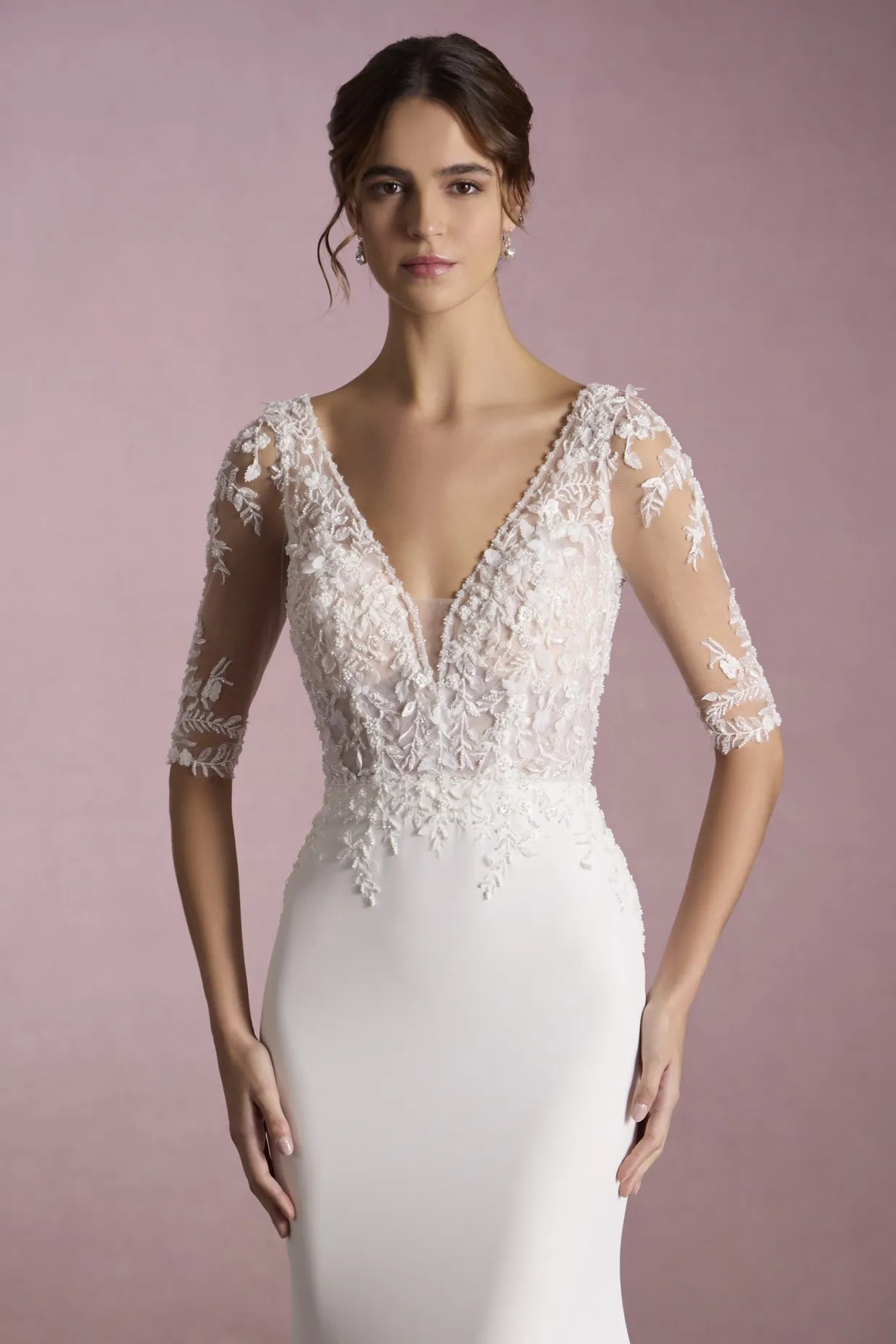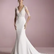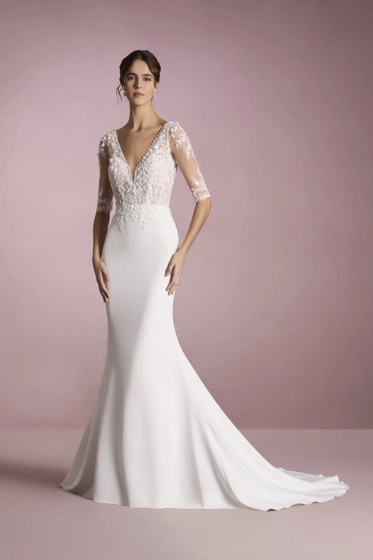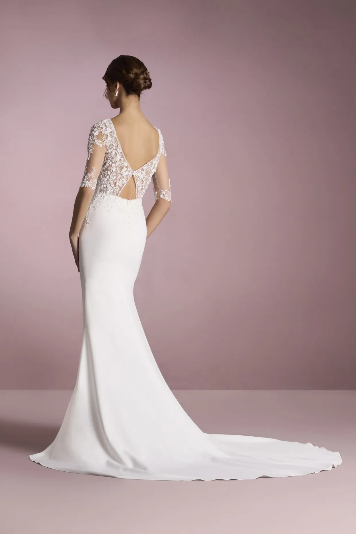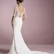 Le modèle ARIDA est une robe coupe sirène sophistiquée en crêpe. Son corsage et ses manches trois-quarts sont ornés de broderies de dentelle et de pierreries. Dans le dos, une délicate fente laisse place à une jupe sobre qui épouse la silhouette de la mariée.