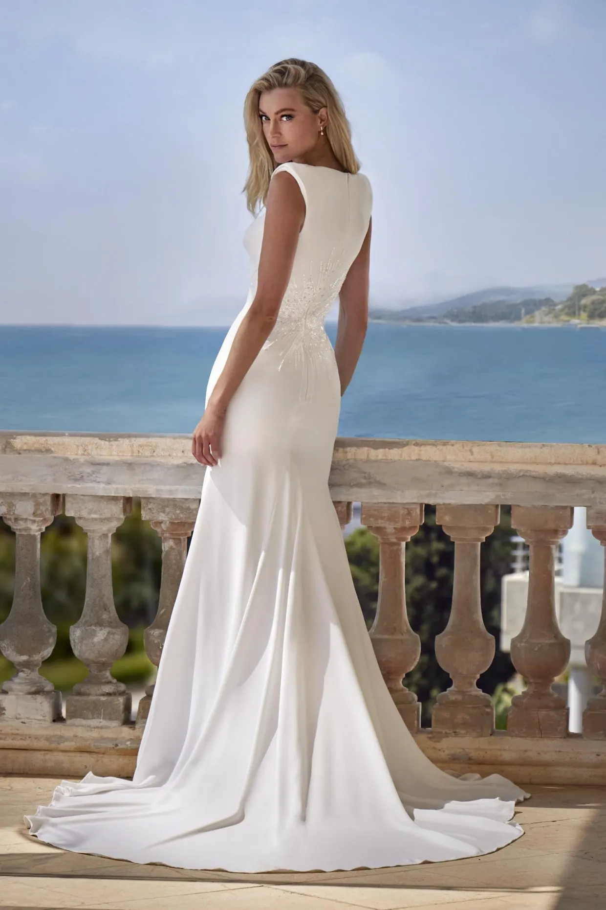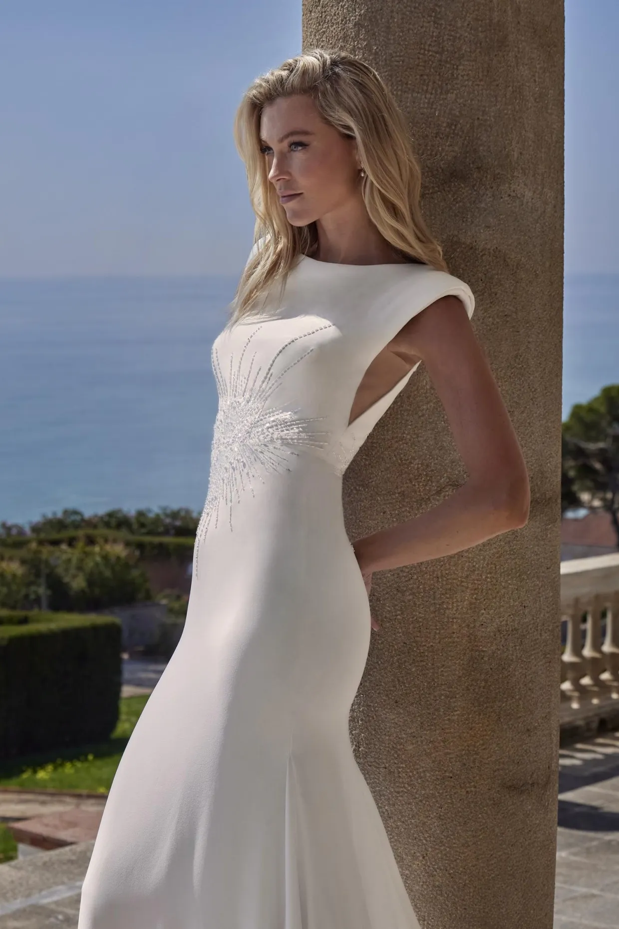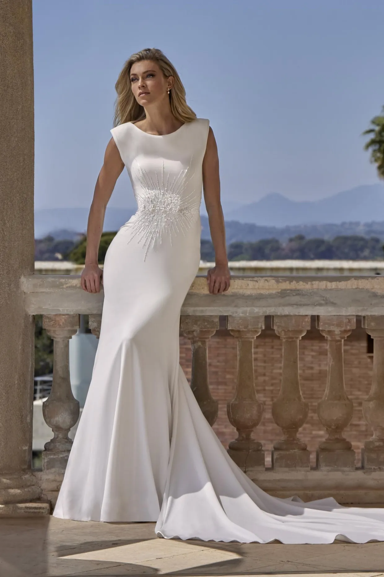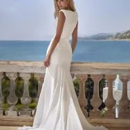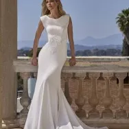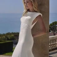 Avec un décolleté rond, des épaules marquées et des perles à la taille, cette robe sirène en crêpe est une proposition élégante et contemporaine. La silhouette est nette et structurée, idéale pour une mariée en quête d’un style épuré aux détails subtils.