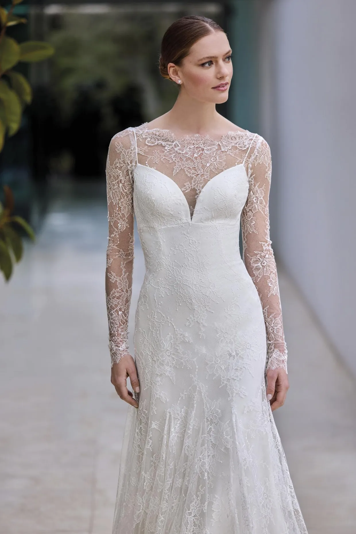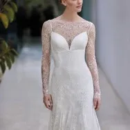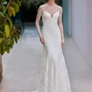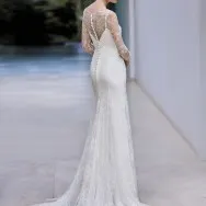 Une proposition polyvalente et raffinée : cet ensemble de deux robes combine un modèle en crêpe avec décolleté et dos en V, et une surrobe en dentelle à manches longues. La silhouette sirène se transforme avec aisance, s’adaptant à chaque moment de la célébration.