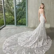 Une robe sirène avec un décolleté en cœur, combinant dentelle de chantilly, perles et broderies, offrant une esthétique luxueuse riche en détails.