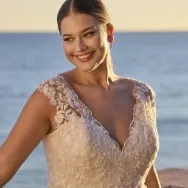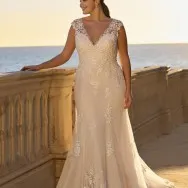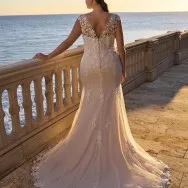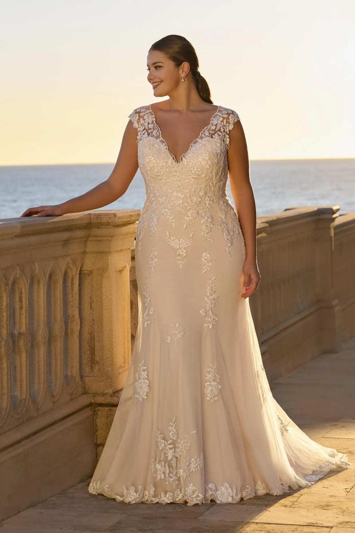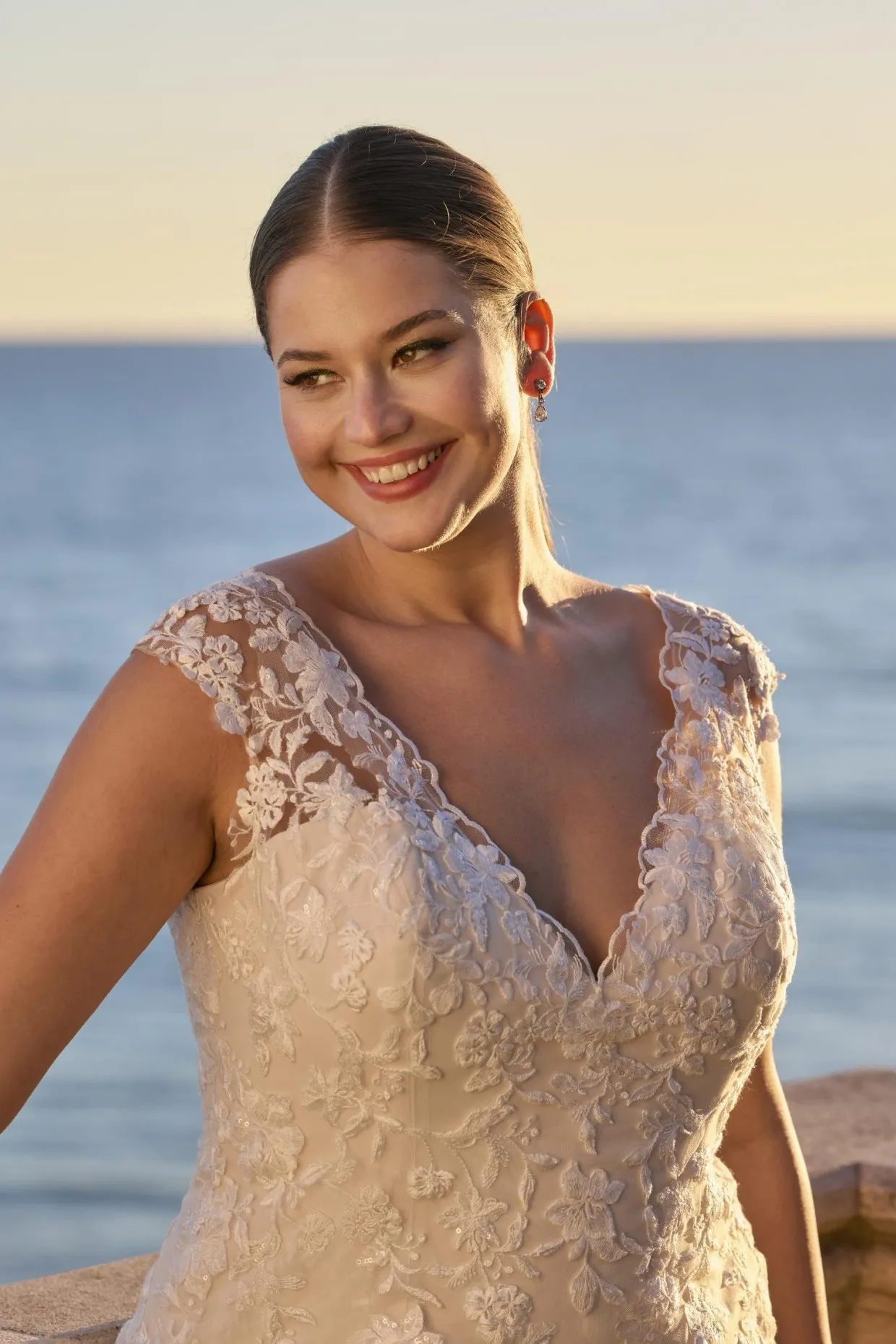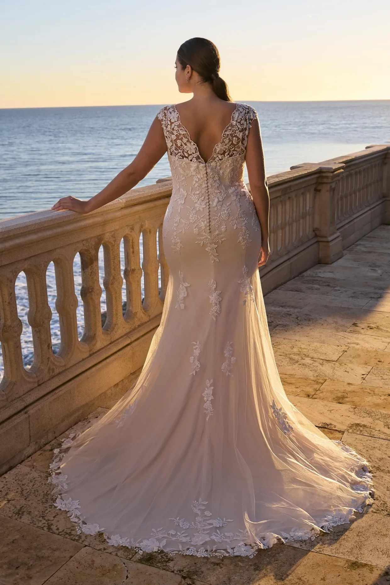 Une silhouette sirène saisissante en tulle, avec un décolleté en V devant et derrière, conçue pour sublimer les courbes avec une élégance raffinée — parfaite pour une mariée audacieuse et confiante.